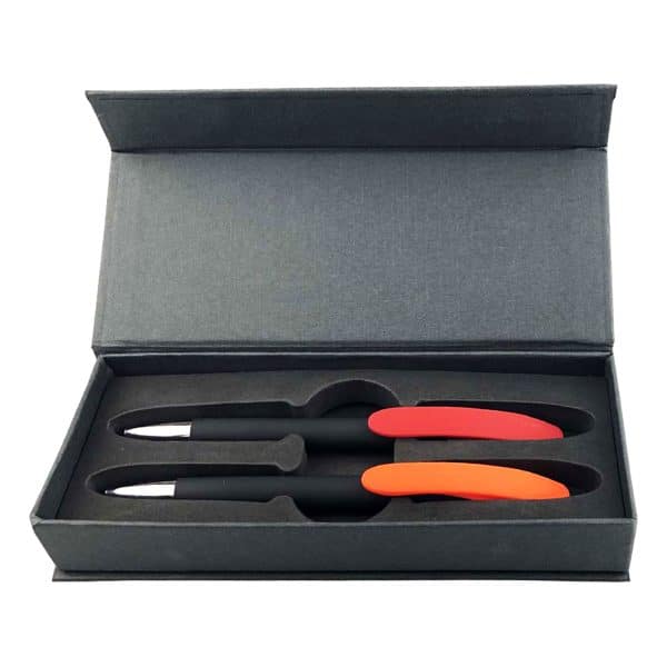 This pen gift set features a modern design with a smooth, soft-touch rubberized black barrel and a vibrant coloured clip. The broad clip offers ample space for customization, while the contrasting colour adds a unique touch. Equipped with a smooth twist action and a shiny silver chrome tip, the pen uses a high-quality cross-type refill with German-manufactured black ink and a tungsten carbide ball, providing up to 1200 meters of writing distance. Presented in a magnetised black gift box with a foam insert, this set combines style and performance, making it a perfect choice for corporate gifting.