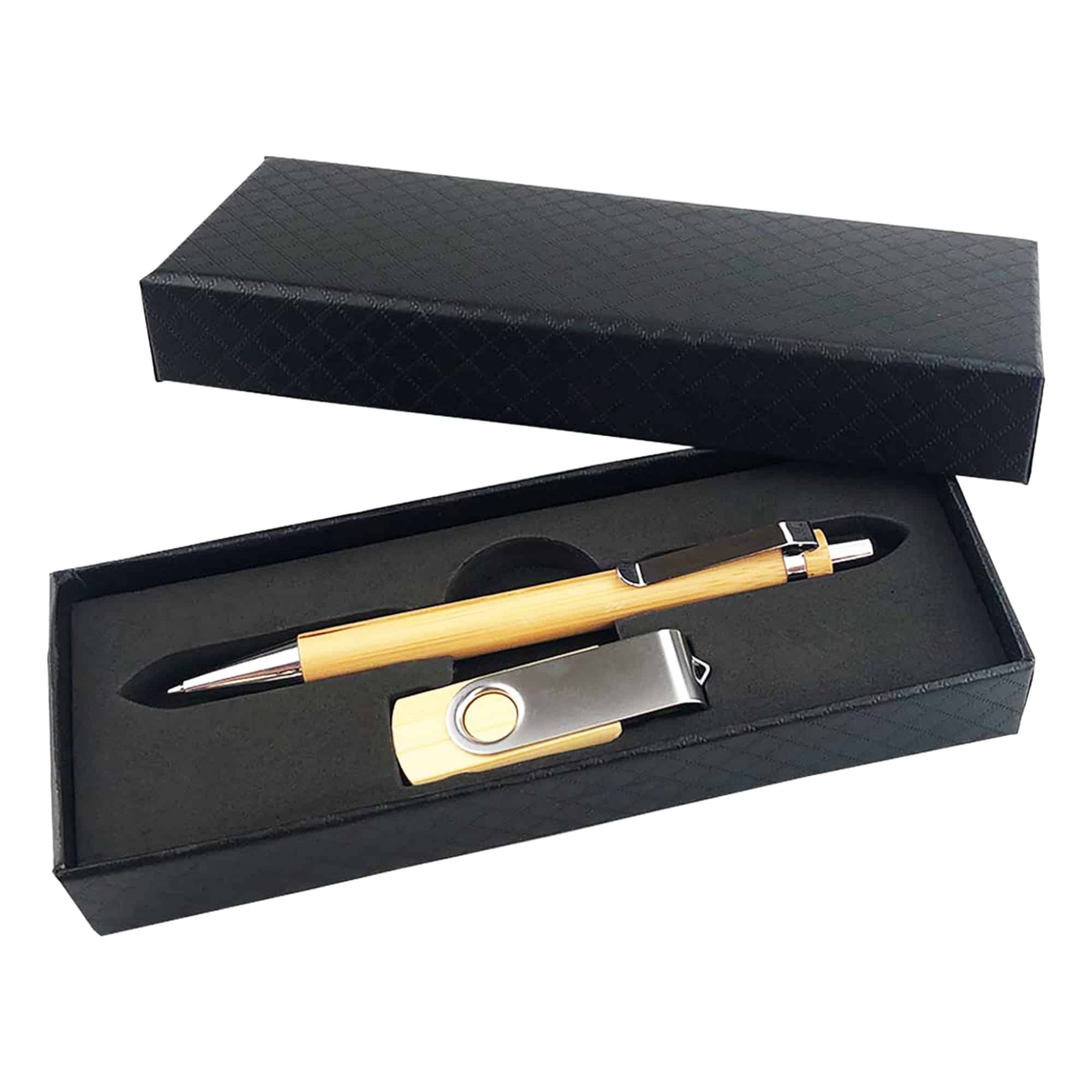 The Bambi Gift Set pairs our sleek Forya Bamboo Pen with the Tallinn Bamboo USB 16GB, all housed in a black cardboard gift box with a custom foam insert. Designed with sustainability in mind, this set is the perfect choice for eco-conscious corporate gifting.