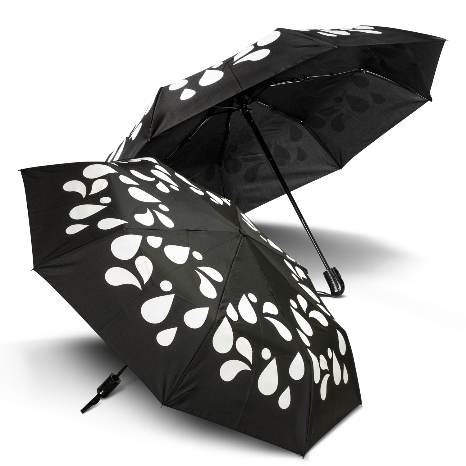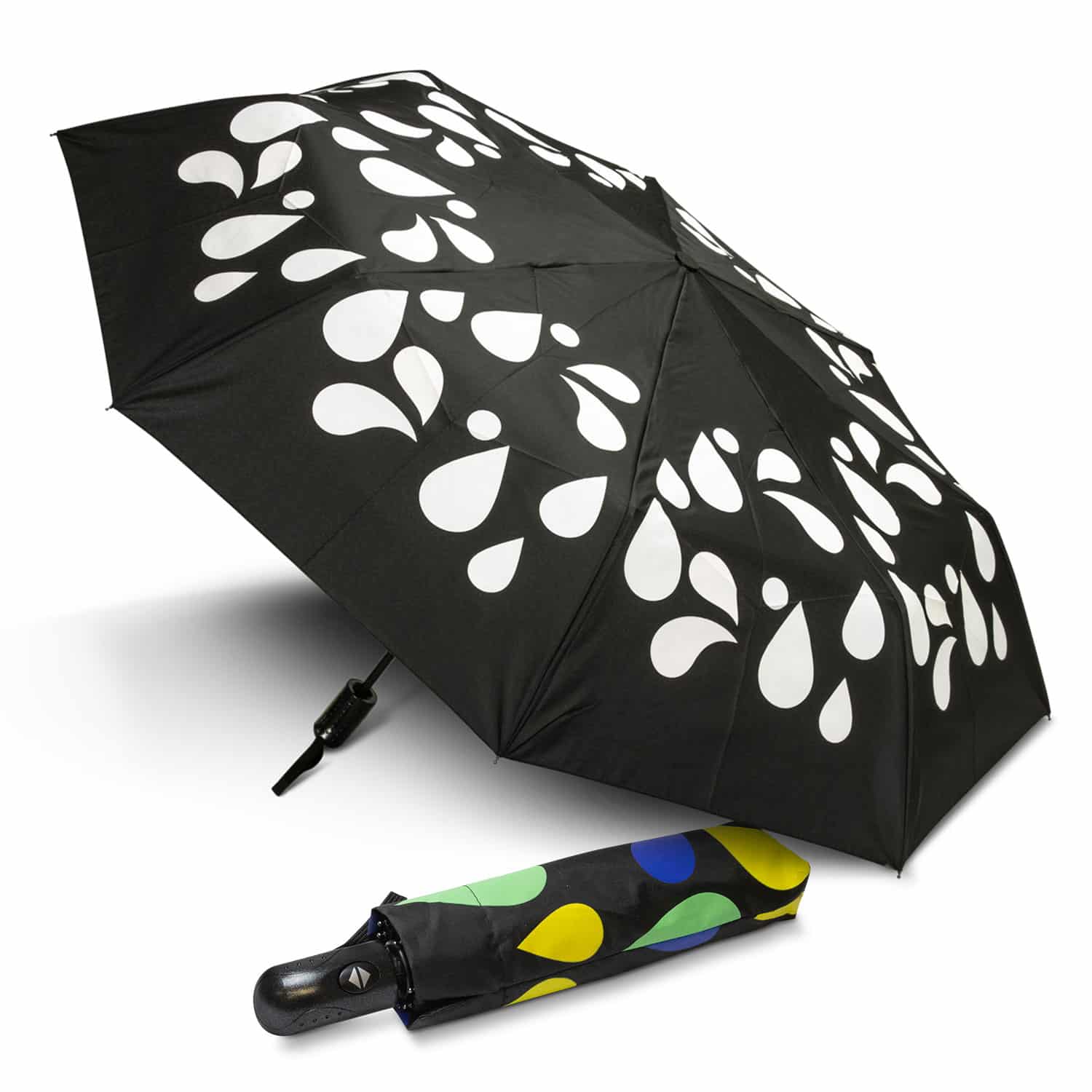 Bring a little magic to rainy days with this compact umbrella, printed with special ink that transforms from white to vibrant colours when wet. Each umbrella comes with a matching sleeve that previews the colours hidden within, adding a playful touch from the moment it is handed over.