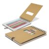 Top opening note pad with 50 leaves of unlined paper and an unbleached cardboard cover. It is wiro bound and has 12 full-size coloured pencils included in a secure plastic sleeve.