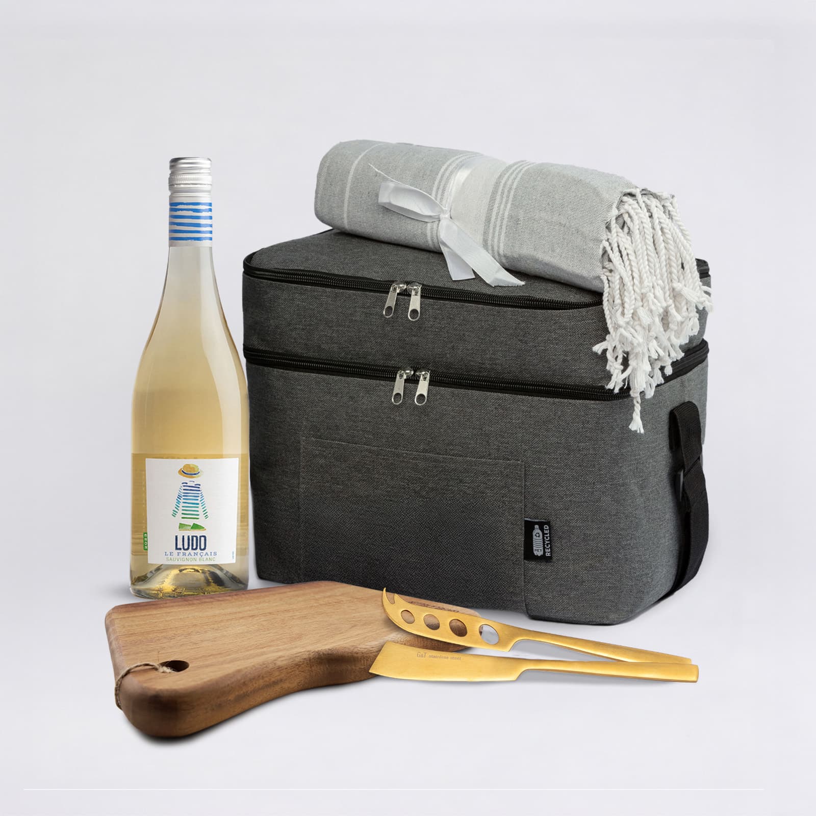Relaxed, refined, and ready to enjoy. A laid-back blend of comfort and class. Inside the sleek grey cooler bag, you’ll find everything needed to wind down and ease into golden hour. A smooth acacia serving board and satin gold cheese knives set the scene, while a bottle of premium wine (choose red or white) brings the celebration. A soft Turkish-style towel finishes the moment with practicality and polish — perfect for park days, housewarmings, or gifts that feel both luxe and thoughtful.
