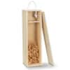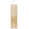 Elegant wine gift box made from natural pine wood with a sliding lid. The box is designed to hold one standard wine bottle and has built-in dividers with shredded paper filling. A woven rope handle makes it easy and comfortable to carry.